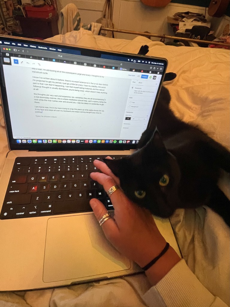 i am home now. i’m in my room trying to wrap this piece up while stella shoves her ass in my face and steps all over my keyboard and keeps coming dangerously close to putting her tiny black paw in my hummus plate.