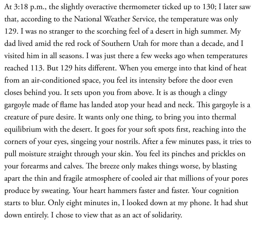 outside of my fugue state, camp continues to provide an abundance of joy and energy. it’s been hot and muggy and shows no signs of cooling. we’re thankful for the warm breezes and for the small bits of rain that break the afternoon heat, even if only for half an hour. it’s crazy to consider that maine summers may look like this for a good long while. prior to writing today i was skimming the news and there was an article in the atlantic from ross andersen, a tech and climate writer who traveled to death valley for the Hottest Reliably-Measured Day In History. i’m pretty captivated by this passage describing the heat: