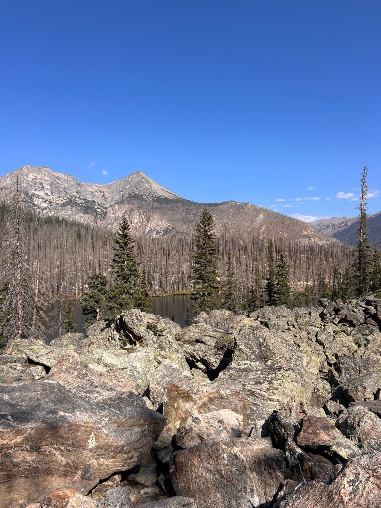 breakfast today was oatmeal packets (from the marriott in fargo) and lemon ginger tea. we were on trail by 930. we were in for a little more of a surprise in terms of topography. after crossing a huge moraine full of lichen-covered boulders we reached fern lake, around which is a huge swath of burn scar from fires in 2012 & 2020.