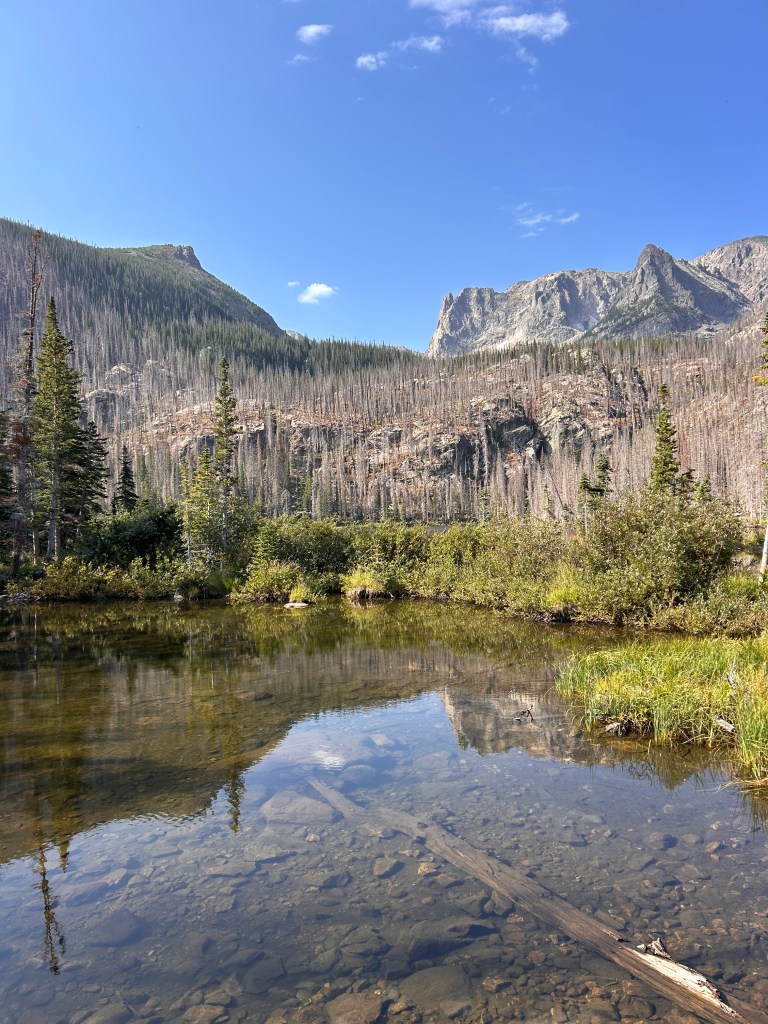 we were covered by the shadow of the mountains to our right for the first part of the hike. the trail winds all the way down to big thompson river and largely follows small tributaries and waterfalls down 1700 feet of elevation. we made decently good time during those first three miles. after fern lake, the trail opens up into acres of charred trees and invasive species choking out what was once the forest floor. this open stretch of trail smelled like sun baked raspberries and crispy autumn aspen leaves. young aspens were everywhere on the trail, piquing sam’s interest and providing small moments of shade amongst the otherwise skeletal forest.