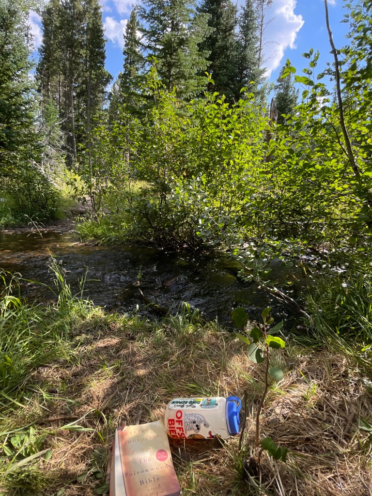 again we’d secured the first pick of two campsites and chose one overlooking a meadow beneath an aspen grove. practicing bear awareness, we quickly set up camp and then headed down to mill creek to spend the afternoon and eat a little lunch. we were both feeling pretty gassed from the hike and with sam’s support we’d had a good reckoning giggle at my earlier uphill plights. in search of a further morale boost we had our final packs of bob l’eponge fruit snacks and sprawled out by the river to read and bask a little. i finished the final chapters of the poisonwood bible in this most idyllic setting.