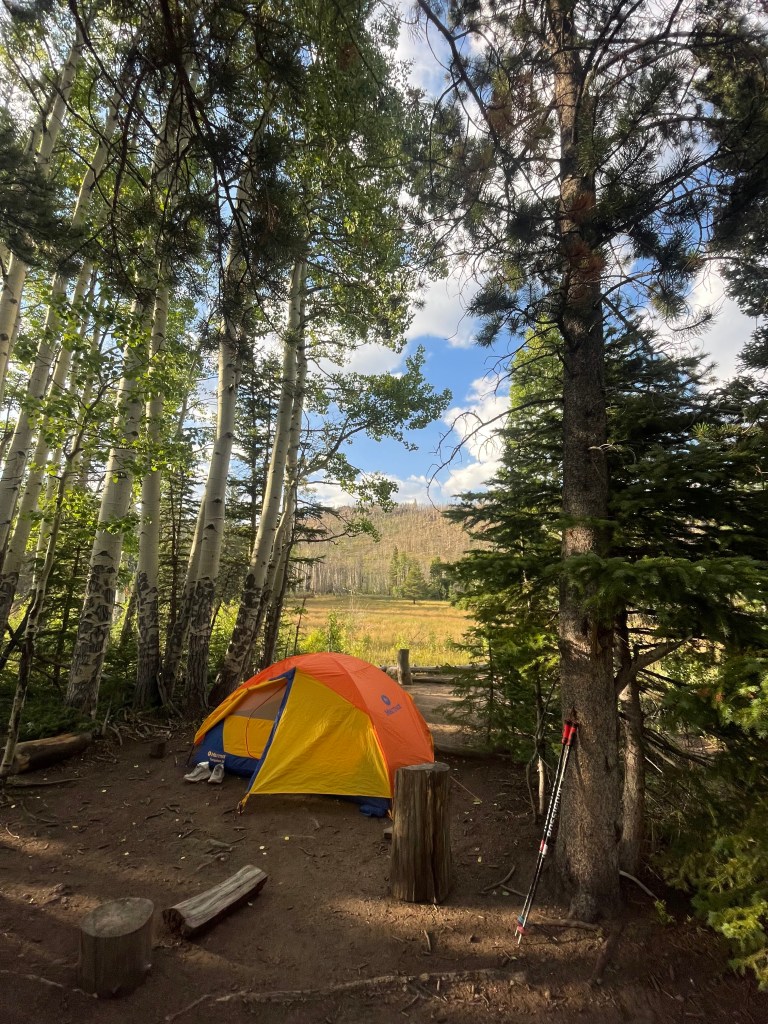 about a half a mile into it i began to feel the effects of the sun and the altitude and dehydration and a heavy pack and it became quite a grueling part of the trip for me. there’s nothing like a steep trail grade with not much canopy to send the brain into a hyper-individualistic spiral. with each step i was questioning my strength & somehow the question of my physical strength was also translating into one about my mental fortitude and i did not want to stop for water or a snack because god forbid it’s my fault it takes us longer to get over this ridge. in spite of the obvious factors against me–the thinner air, the heat, the weight on my back–i could not find rationale and felt like an absolute loser trudging uphill. there was another part of me battling back and suggesting that the difficulty i was having didn’t necessarily mean i’m an objectively weak person. eventually i gave up on thinking and resorted to one step in front of the other until we crested the ridge and began the mile descent into our campsite.